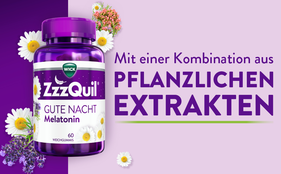 Das Leben ist besser, wenn man besser einschläft. Manchmal halten uns jedoch Sorgen des Tages abends vom Einschlafen ab. Wie es der Zufall will, scheinen die schlaflosen Nächte immer dann zu kommen, wenn man seine ganze Energie braucht, um den kommenden Tag zu bewältigen. Für solche Zeiten haben wir WICK ZzzQuil® Gute Nacht entwickelt, ein Nahrungsergänzungsmittel mit Melatonin, das Ihnen hilft, schneller einzuschlafen* und durch Vitamin B6 am nächsten Tag erholt aufzuwachen**, ohne Müdigkeit am nächsten Tag. Melatonin ist ein körpereigenes Hormon, das keinen Gewöhnungseffekt verursacht. Nehmen Sie es einfach bei Bedarf ein und beenden Sie die Einnahme, wenn Ihr Schlaf-Wach-Rhythmus wieder reguliert ist.